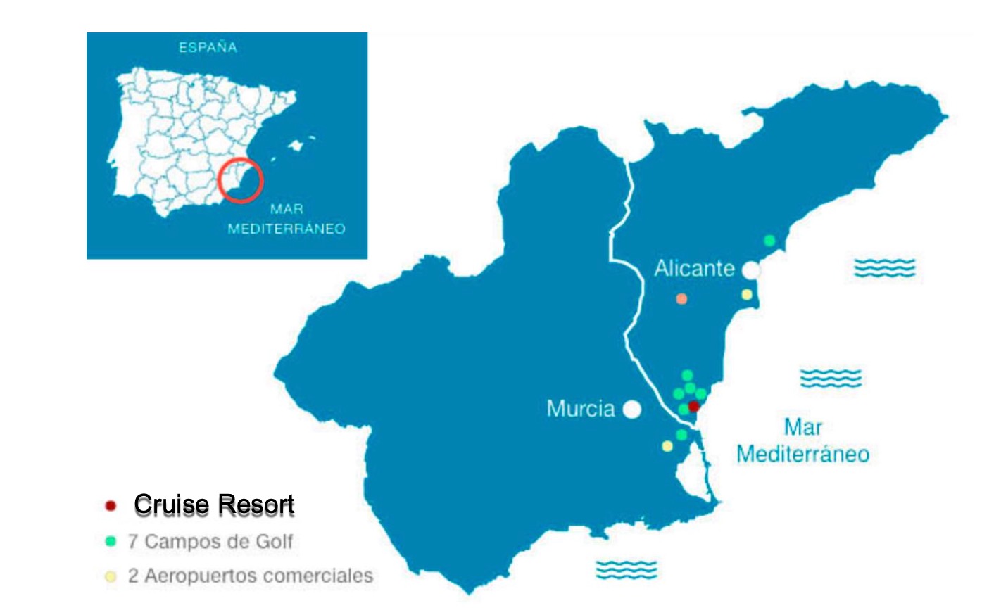 Die Apartments des Cruise Resort in San Miguel de Salinas befinden sich in den florierenden Vierteln Villamartin, Campoamor und Cabo Roig der benachbarten Provinz Orihuela Costa in Alicante. In der Gegend Playa Flamenca befindet sich das größte Einkaufszentrum der Costa Blanca, La Zenia Plaza. Orihuela Costa liegt an der Südküste Spaniens, in der Nähe des Mar Menor und der bekannten Gegend La Manga. Viele Golfer kommen jedes Jahr in die Gegend, um die sieben Golfplätze zu genießen, die vom Paradise Resort aus leicht mit dem Auto zu erreichen sind. Das Mikroklima der Region, das durchschnittlich 300 Sonnentage pro Jahr bietet, ist ein weiteres wichtiges Verkaufsargument. Die Lebenshaltungskosten sind niedriger als in anderen Küstengebieten Spaniens und die meisten Geschäfte sind das ganze Jahr über geöffnet, was die Attraktivität der Region noch erhöht.